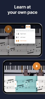 flowkey direka untuk menjadikan setiap sesi latihan interaktif dan berkesan. Bagi yang baru bermula, ikuti langkah demi langkah kursus membaca notasi, menavigasi papan kekunci, dan bermain dengan kedua tangan dengan mudah. Pemain yang mahir pula boleh meningkatkan kemahiran melalui tutorial mendalam mengenai skala, kord, dan improvisasi. Dengan ciri-ciri pintar seperti 'Wait Mode' yang menanti anda menekan not yang betul, 'Loop' untuk mengulang bahagian sukar, dan 'Select a Hand' untuk latihan tangan berasingan, pembelajaran menjadi lebih fokus. flowkey berfungsi lancar dengan piano akustik, piano digital, atau papan kekunci anda, hanya memerlukan peranti anda (telefon, tablet, atau komputer riba) dan aplikasi flowkey itu sendiri.